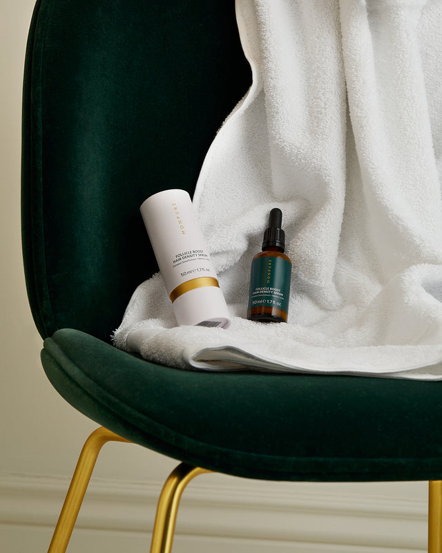 Finish with the best-selling Follicle Boost Hair Density Serum that works to stimulate the scalp, promote cell renewal and decongest follicles for maximised hair growth. It innovatively combats fallout by blocking the production of DHT, fostering thicker and fuller hair.